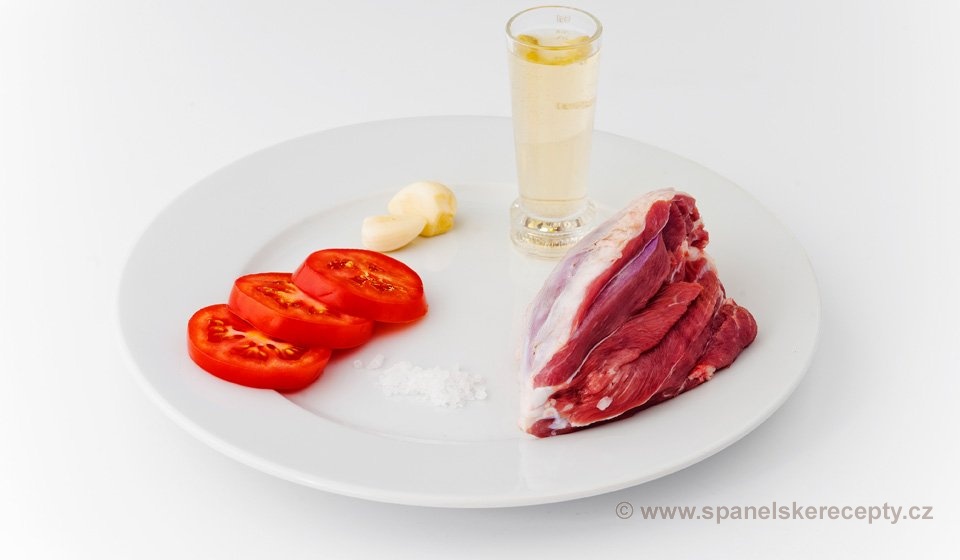 Jehněčí dáme do pekáče. Česnek oloupeme a nakrájíme na kolečka stejně tak, jako rajčata. Podlijeme olejem a dáme péct do trouby na 180 stůpňu pečeme do hotova . Těsně před upečením přelijeme bílým vínem a dáme ještě na chvíli péct.