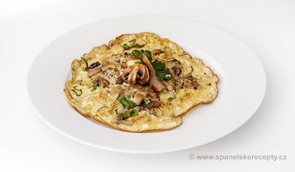 Rozmícháme si vejce, osolíme a opepříme je a přidáme již hotovou směs ze žampionů. Zbytek oleje dáme na pánev, vlijeme připravenou směs a omeletu osmažíme.