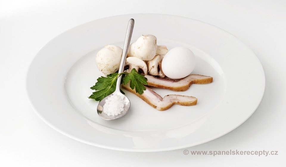 Žampiony očistíme a nakrájíme na menší kousky. Špek si nakrájíme na drobno a osmahneme. Přidáme nakrájené žampiony a petržel. Osmažíme a necháme stranou - scedíme.